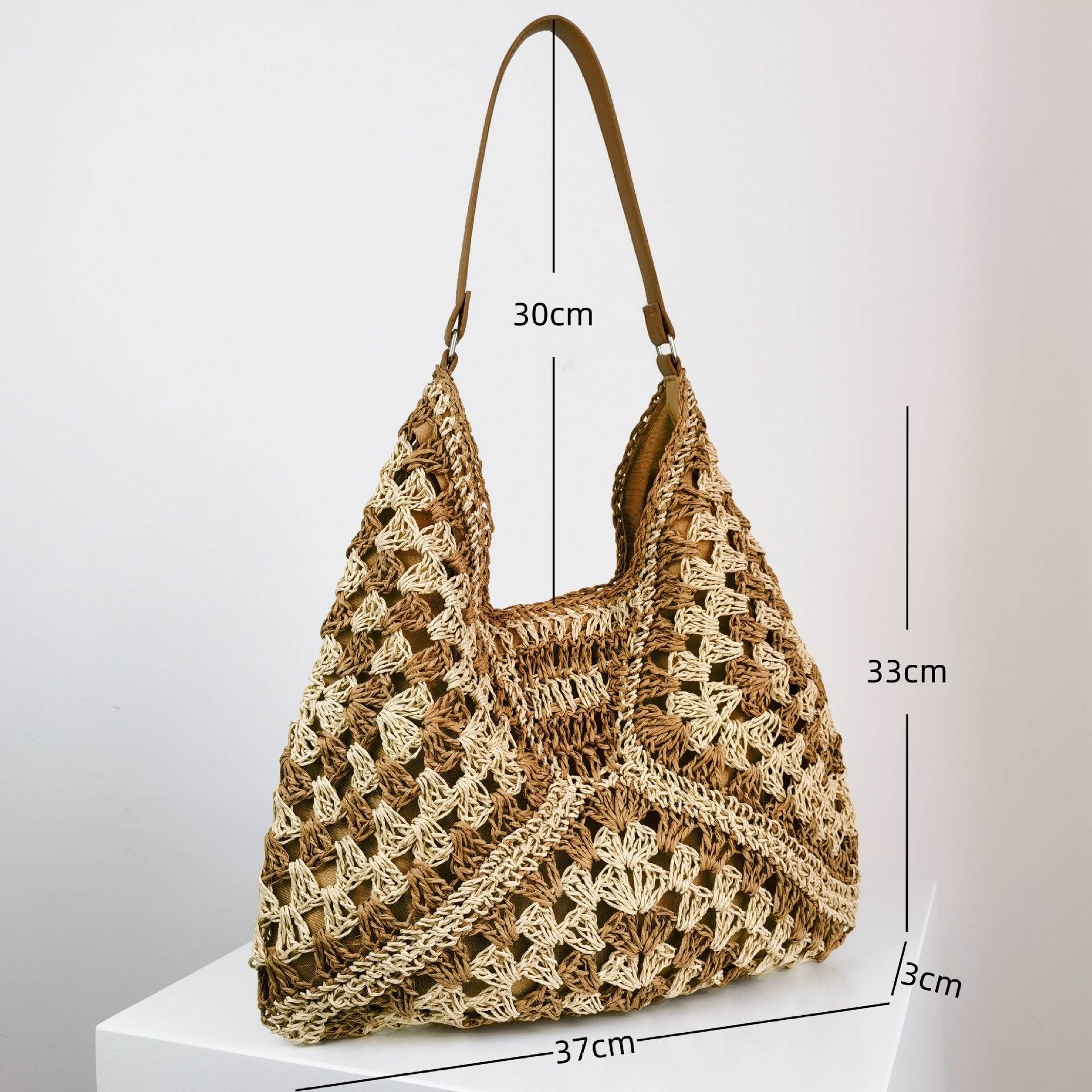 Women's Fashion Handmade Straw Woven Hollow Contrast Color Weave Shoulder Bag
